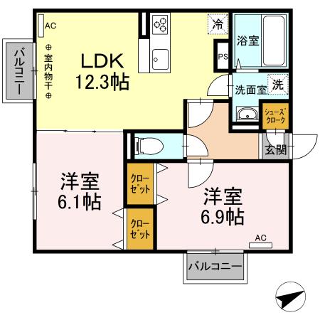間取り 2LDK 間取り詳細 LDK12.3 洋6.9 洋6.1